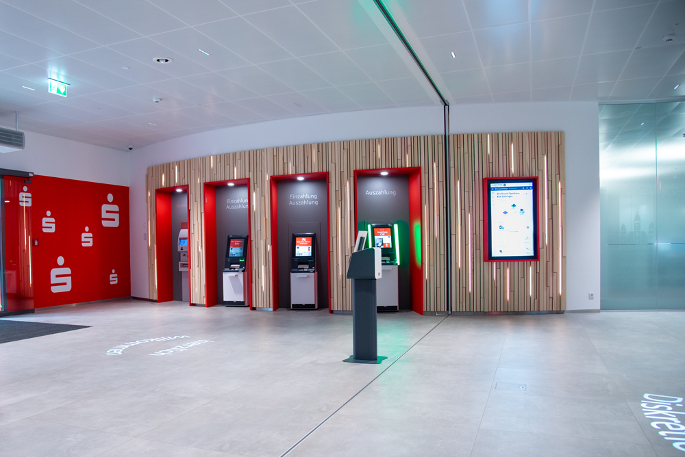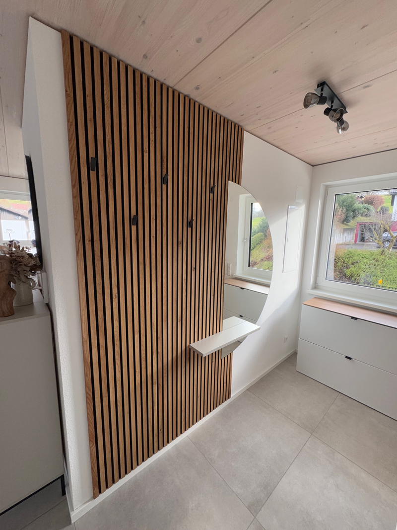 Schreinerei Meroth - Moderner Waschraum mit Holzdecor und Hochglanzfront
