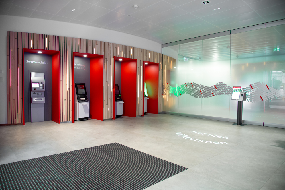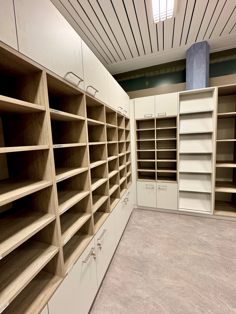 Türdurchgang verschlossen mit Regal und Glaselement beleuchtet