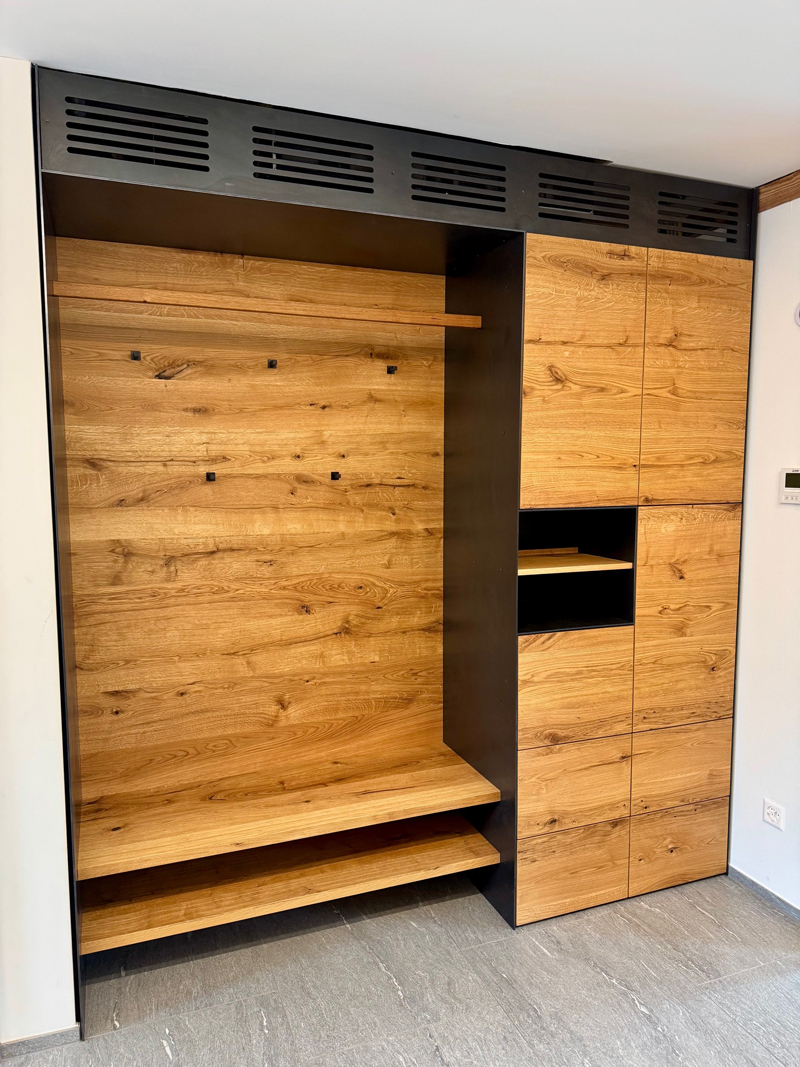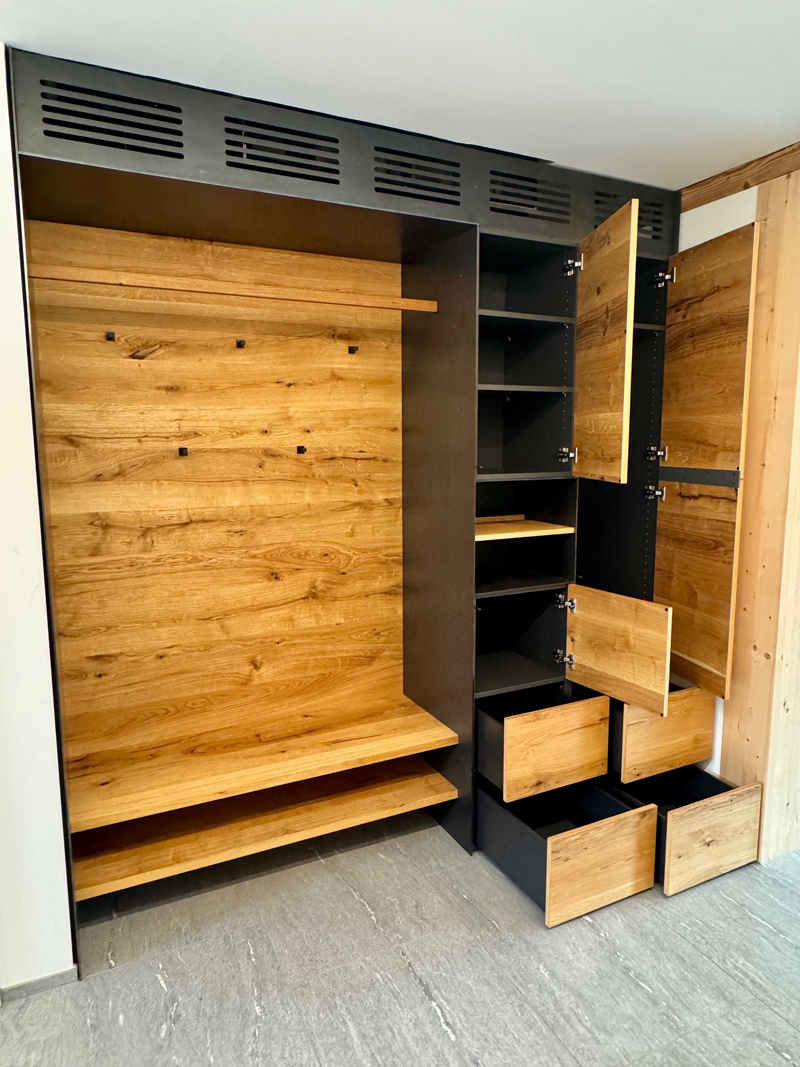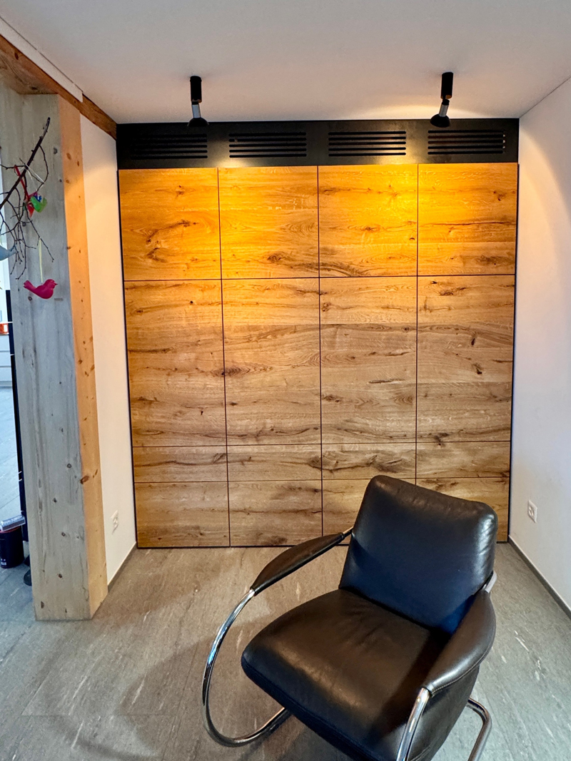 Massivholzmöbel mit integrierter Schaltleiste in Klappe Massivholzmöbel mit integrierter Schaltleiste in Klappe